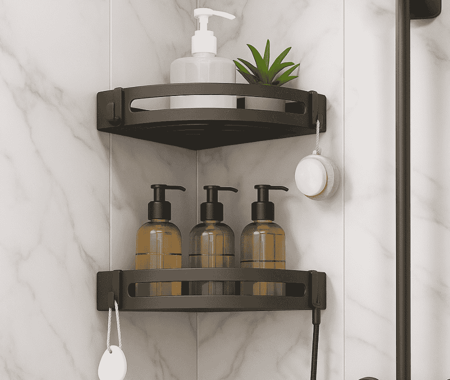 • מדף מקלחת פינתי חכם חוסך מקום ומאפשר ניצול מושלם של חלל המקלחת.