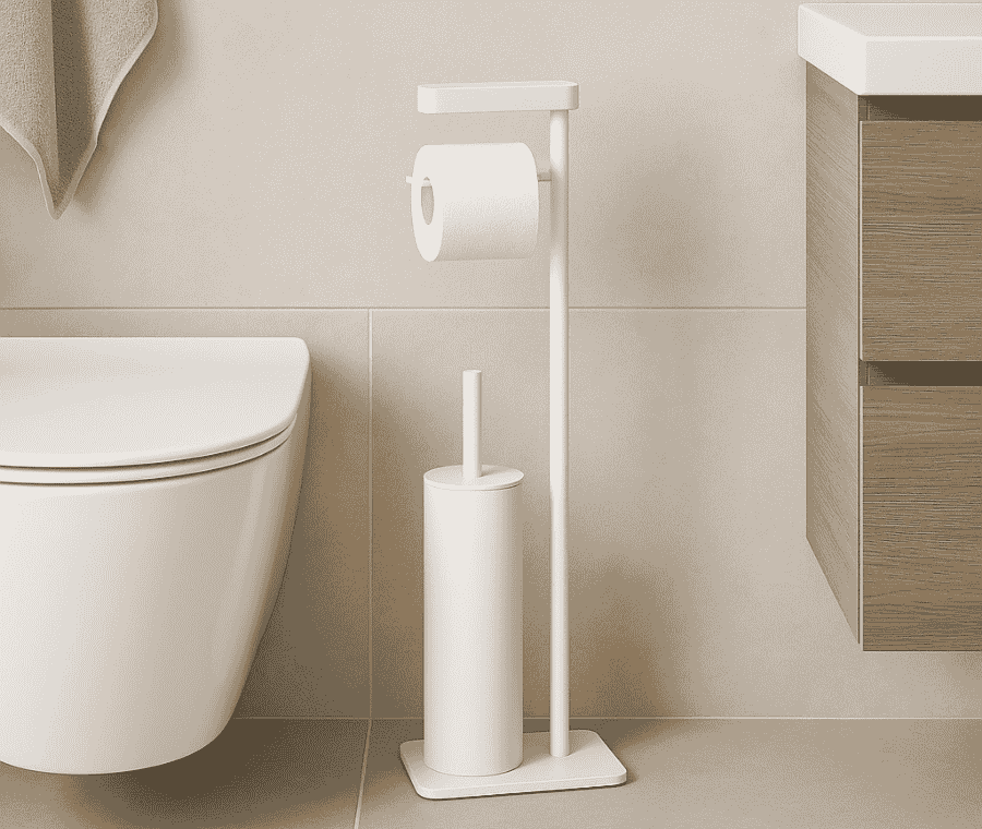 מעמד איכותי ואלגנטי לנייר טואלט הכולל מברשת אסלה עם ראש נשלף להחלפה קלה ומדף עליון