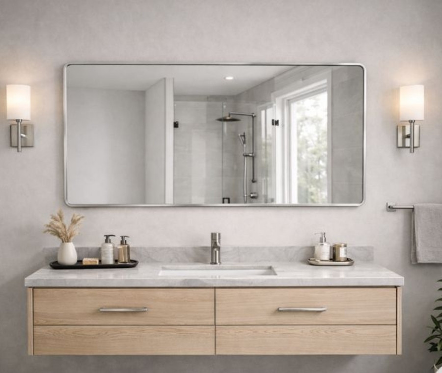 מראה מלבנית בעיצוב מודרני ונקי עם מסגרת צבע כסף יוקרתית,