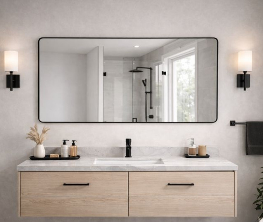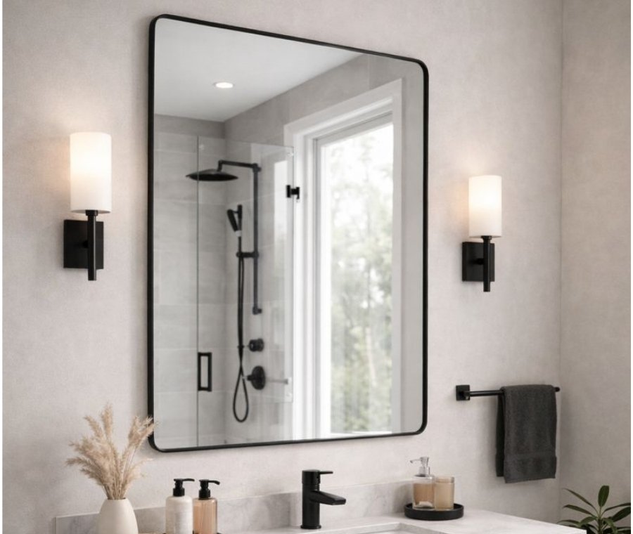 מראה מלבנית בעיצוב מודרני ונקי עם מסגרת שחורה יוקרתית, המשלבת איכות גבוהה,